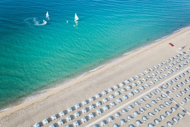 L’accesso alla spiaggia è diretto, con ambienti naturali intorno e vegetazione che incornicia il resort.